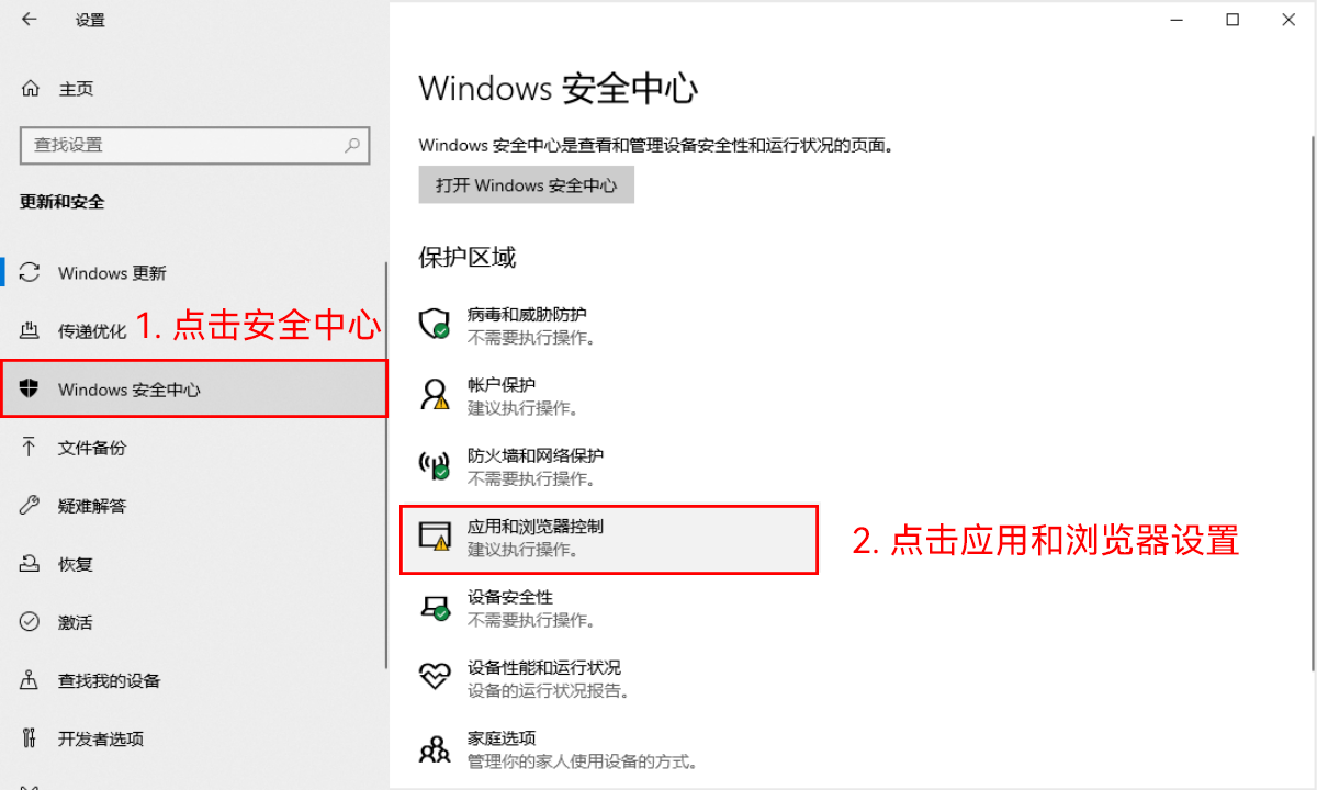 4. 进入"Windows安全中心",点击"应用和浏览器控制"